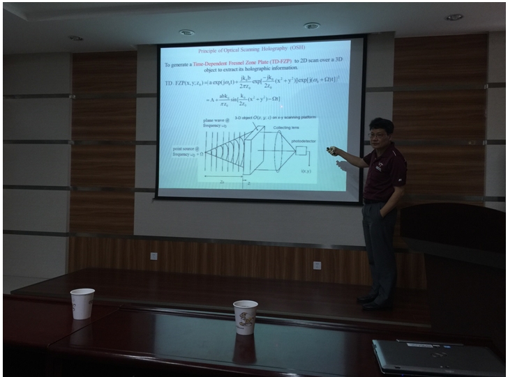 2015年5月30日上午,来自美国弗吉尼亚理工大学的T.C. POON教授,在文理楼254报告厅举行了“光学扫描全息术的进展”的专题报告,报告由焦志勇教授主持。光学扫描全息术(OSH)是一个独特的数字全息技术。该技术利用二维活动的光学外差扫描实现三维(3-D)的实时全息物光记录。到目前为止,该技术的应用包括光学扫描加密,光学显微镜,三维模式识别,三维全息电视,和三维光学遥感。在演讲中,将首先提供一个扫描光学全息的概述,随后将评论最近的一些已经取得的进步,以及未来可能的应用和效益。 T.C. Poon教授,弗吉尼亚理工大学电气和计算机工程学院教授。目前的研究兴趣包括三维图像处理,和光学扫描全息术。是专著《光学扫描全息术与MATLAB》(Springer,2007),教材《现代数字全息与MATLAB导论》(剑桥大学出版社,2014),《利用MATLAB的工程光学》(世界科学2006),《用MATLAB的当代的光学图像处理》(Elsevier 2001),和《应用光学原理》(McGraw-Hill,1991)的作者。他也是《数字全息三维显示》(Springer 2006)的编辑者。并担任期刊国际光电子和光学工程客座编辑。Poon博士曾担任应用光学编辑,目前是《中国光学快报》副主编,和IEEE工业信息学副主编。他是美国光学学会(OSA)和OLT的主体编辑。Poon博士是OSA协会、SPIE、IOP的资深会员、IEEE高级会员。 (周伟) |