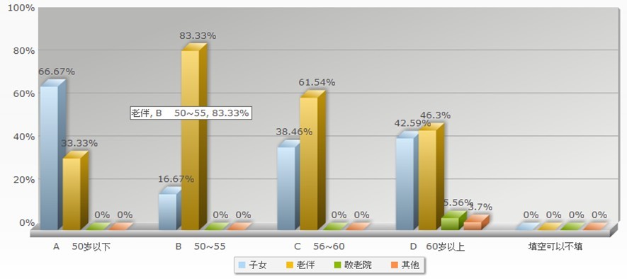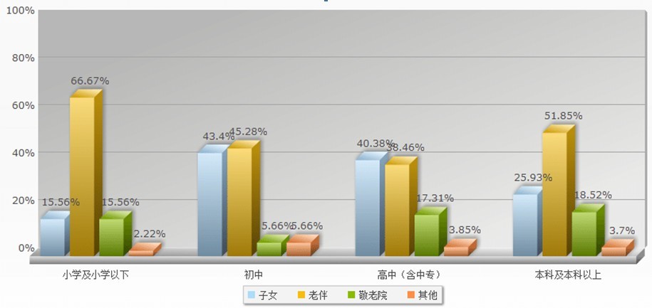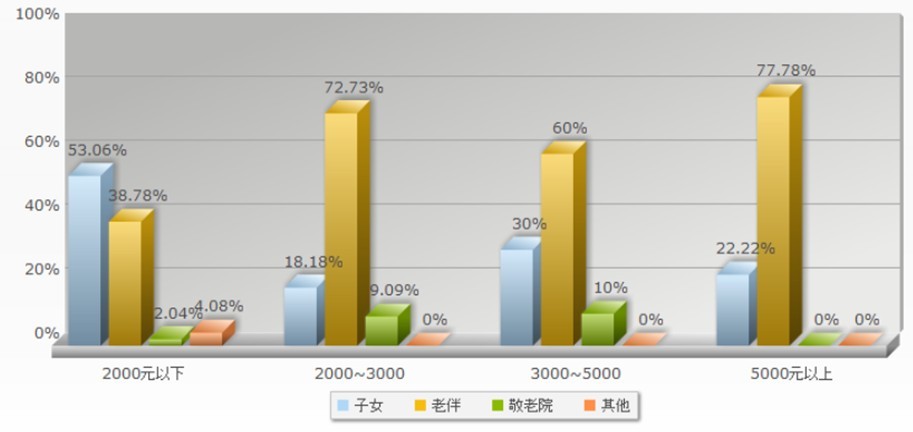 三天之内,我们在调查中发现不同收入阶层的人所关注的养老方面的问题各有不同。但大体都包括医疗问题---农村合作医疗报销的受限,医疗设施有待完善,医务人员紧缺等现。同时,社会低保问题也是很多人关注的焦点,具体包括城乡低保额的差距,城乡间迁移人口的社会低保如何处理等。此外,周围养老机构不健全,居住环境也有待提高,致使准老年人对敬老院这样的养老机构有所顾虑,更关键的是养老机构大多收费高,使很多老年人难以接受。经过对数据的整理,我们通过柱状图可以直观的看出,虽然年龄段不同,但大部分调查对象更乐于同子女或老伴居住。