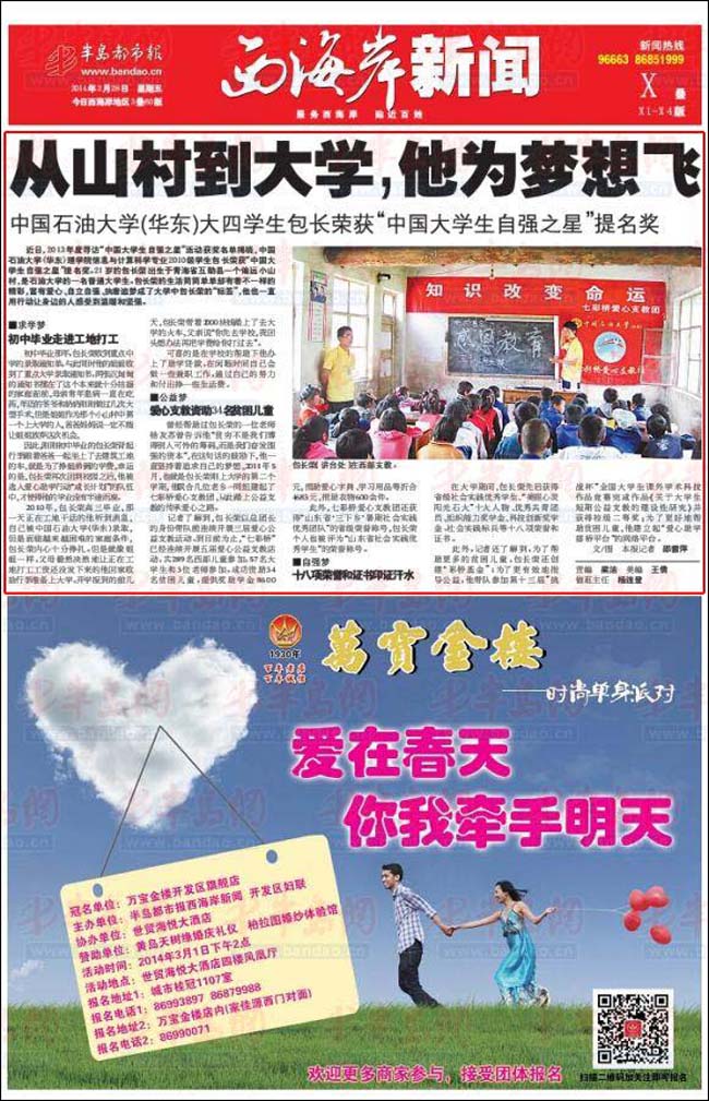 近日,2013年度寻访“中国大学生自强之星”活动获奖名单揭晓,中国石油大学(华东)必赢线路检测中心信息与计算科学专业2010级学生包长荣获“中国大学生自强之星”提名奖。21岁的包长荣出生于青海省互助县一个偏远小山村,是石油大学的一名普通大学生。包长荣的生活简简单单却有着不一样的精彩,富有爱心、自立自强、执着追梦成了大学中包长荣的“标签”,他也一直用行动让身边的人感受到温暖和坚强。