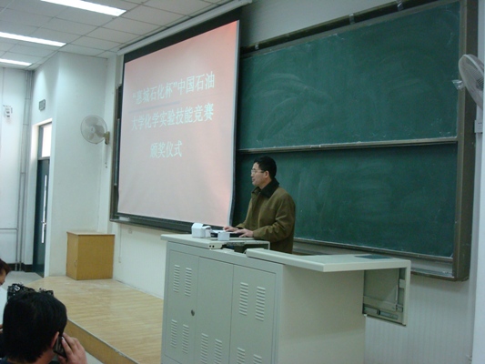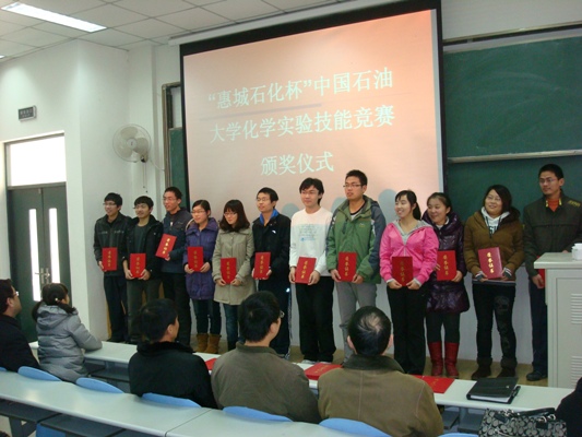 12月18日上午,“惠城石化杯”第三届化学实验竞赛闭幕式暨颁奖仪式在讲堂群东环105隆重举行,学院副院长战风涛教授、化学系党政领导姜翠玉教授、张龙力、张志庆、于剑峰、周玉路老师出席颁奖仪式并为获奖同学颁奖。张志庆主持了闭幕式。 战风涛教授在颁奖仪式上讲话。他首先对青岛惠城石化科技有限公司的大力支持、老师和同学们的积极参与表示感谢,对获奖同学表示祝贺。战院长介绍了本次实验竞赛的目的、理念和意义,总结了竞赛取得的可喜成果及发现的问题。最后战院长强调了化学实验竞赛的宗旨“重视参与、重视过程、重视学习,淡化名次”。他表示,今后此类活动我们还会继续举行,在经费允许的情况下将扩大学生参与的范围和数量。 据悉,本次化学实验竞赛从12月8日开始至12月18日结束,旨在通过竞赛全面推进我校化学实验教学建设和改革,推动设计性、综合性、创新性实验教学的开展,检验实验教学成果,激发学生学习和从事实验研究的兴趣和热情,引导和培养学生的综合能力和创新能力。我校2009级材料化学、应用化学、化学工程与工艺、环境工程四个专业126名本科生参加了此次竞赛,经过理论考试和实验操作,最终评出一等奖12组,二等奖、三等奖、优胜奖各10组。 化学系全体老师参与了筹备工作,竞赛还得到我校化工88级著名校友、青岛惠城石化科技有限公司董事长张新功的大力支持。(化学系 卢玉坤 张志庆)  学院副院长战风涛教授讲话  获奖同学合影 |