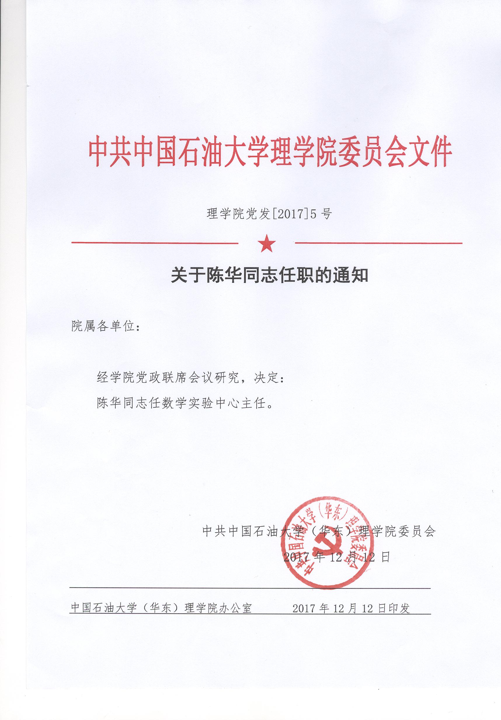 必赢线路检测中心党发[2017]5号 关于陈华同志任职的通知