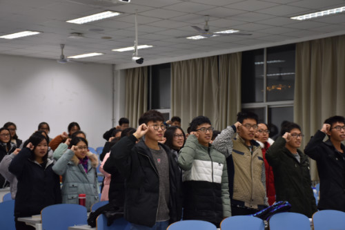 活动伊始,主讲人从共青团的性质入手,介绍了共青团的历史沿革,同时与观众互动,通过小测试考验同学们对共青团的了解程度。随后,用一系列数字展示了共青团如今的发展规模和影响力。继而承上启下,引出了与共青团有关的重大历史事件,从1919年的五四运动,到1925年的五卅运动,再到1935年的一二九运动,展示了共青团艰难的发展史。紧接着通过列举青年楷模,为17级团员指明方向:共青团员享有团章规定的权利,同时也应该履行团员的义务。活动最后,全体起立,在主讲人的带领下重温入团誓词。