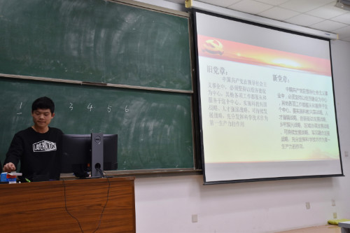 活动伊始,主持人以“新旧党章找不同”的游戏方式切入主题。全体同学分成六个小组,每题抢答,气氛活跃,由王凯记录分数。主持人在每次抢答后仔细讲解不同原因,尤其强调社会主义核心价值观、生态文明建设和一带一路有关问题。抢答结束后,对得分最高的小组提出了表扬。