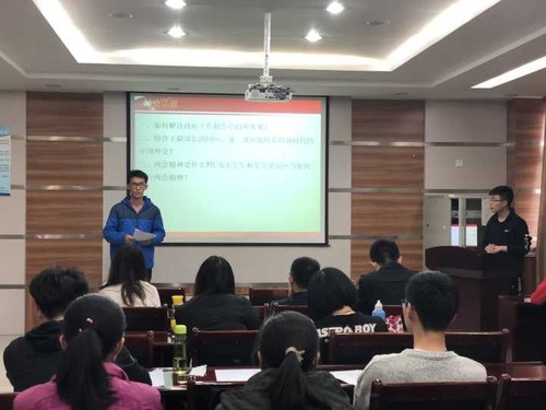 会议主要分为政府工作报告要点,宪法修改前后对比,王毅部长“十大霸气回应”,两会热点解读,以及分组讨论等五个部分。会议伊始,于鹏简要的为大家普及了两会的基本知识,并强调本次会议以共同学习两会精神为主题,深入展开讨论,旨在提高党员和入党积极分子的素质,强化政治担当。随后,党员陈泽、盛海龙先后从宪法修改前后对比,以及两会热点解读两个方面分享自己的观点与体会,其间赢得了大家的一片热烈掌声。会议最后一项分组讨论,三个小组气氛热烈,情绪高涨,分别就“如何解读政府工作报告中的世界观”“王毅部长回应中所反映的新时代中国外交政策”以及“两会精神是什么及当代大学生如何践行两会精神”三个方面各自发表了的理解与体会,于鹏同志并作了简要总结,大会圆满结束。