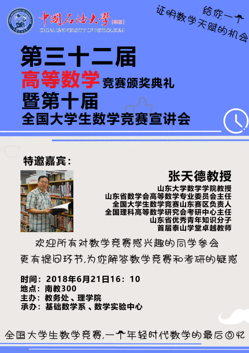 为表彰优秀个人和团体,总结本届大赛的经验,更好地推动大学生数学竞赛的开展,并为全国大学生数学竞赛开展创造良好的氛围。定于2018年6月21日(周四)下午4:10,在南教300举行数学竞赛颁奖典礼,并邀请山东大学教授、全国大学生数学竞赛山东赛区负责人张天德作报告,就第十届全国大学生数学竞赛暨第九届山东省大学生数学竞赛进行宣讲。