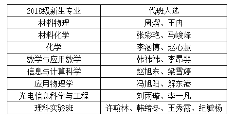 为帮助大家更快更好的了解学校,学院为每个班级配备了一名优秀学长或学姐作为代理班主任。下面是各个班级的代理班主任名单(已加入我校理学院2018新生QQ群),学院为新生分班结束后,会建立各班的易班群和QQ群,届时请各班新生和代班及时入群。