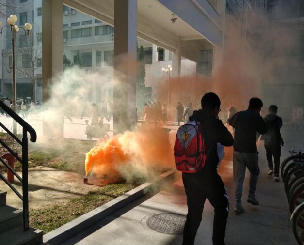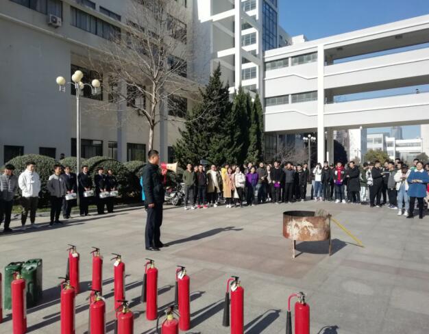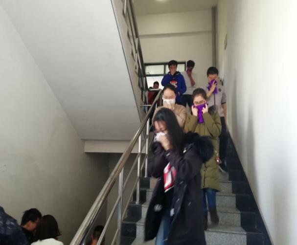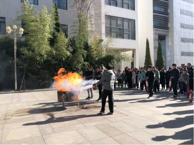 演习安排在物理实验中心本学期首次开课时间段,待火警警铃和紧急撤离广播响起的第一时间,任课教师指挥学生迅速有序撤离实验室,各楼层安全出口处负责疏导人员引导学生快速有序撤离到疏散集结地点,并对实验室内有无未撤离人员进行了检查,专人负责楼内电梯迫降至一层停用,1分20秒后,全体师生安全撤离至集结地点。我校保卫处石鹏飞科长在集结处向全体师生讲解了火灾发生时需注意的事项和应对办法,并演示了灭火器的正确使用操作方法,随后部分师生们使用灭火器对模拟火点进行了灭火演练。