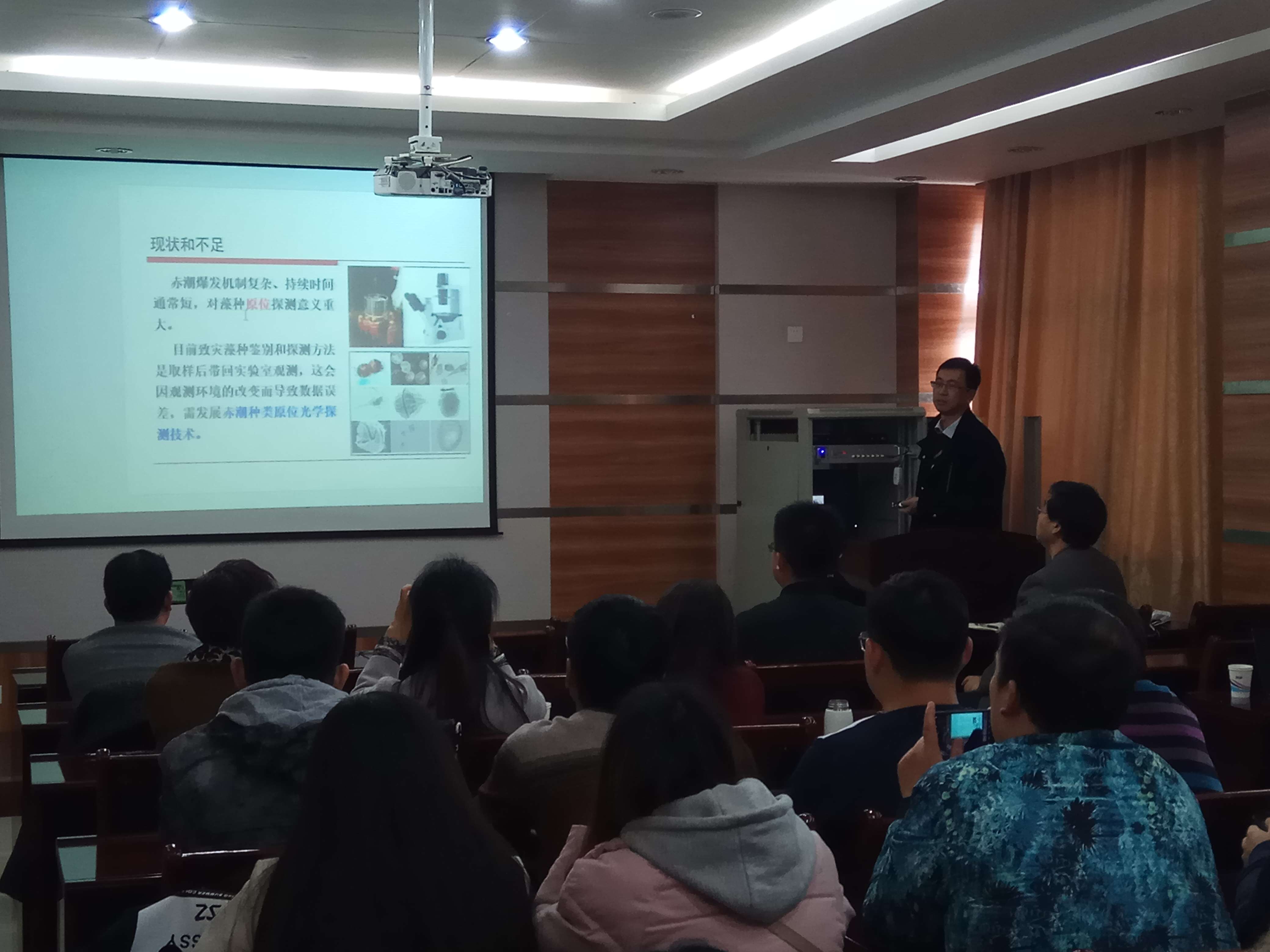 崔廷伟研究员首先作了题为“海洋环境安全保障中的光学问题”的学术报告。报告中,崔廷伟研究员介绍了目前我国海洋环境安全保障所面临的一系列问题和痛点,并提出了光学在解决这些问题中的重要价值。针对海洋环境的检测问题,崔廷伟分别从微弱光信号的采集与处理、复杂光谱信号分辨与处理、光学传感器的防生物附着、光学传感器高精度自动定标、滨海湿地鸟类观测五个方面进行了分析并提出了改进方案。随后,崔廷伟研究员还与我院光电科学与工程系的教师以及研究生进行了深入讨论,指出偏振等光学方法在海洋领域的应用刚刚起步,海洋光学领域大有可为。任广波副研究员、博士给大家作了题为“海洋典型生态系统遥感监测及技术问题”的学术报告,介绍了第一海洋研究所的光学遥感研究方向,并介绍了光学在海洋环境卫星遥感监测中的一些具体应用。