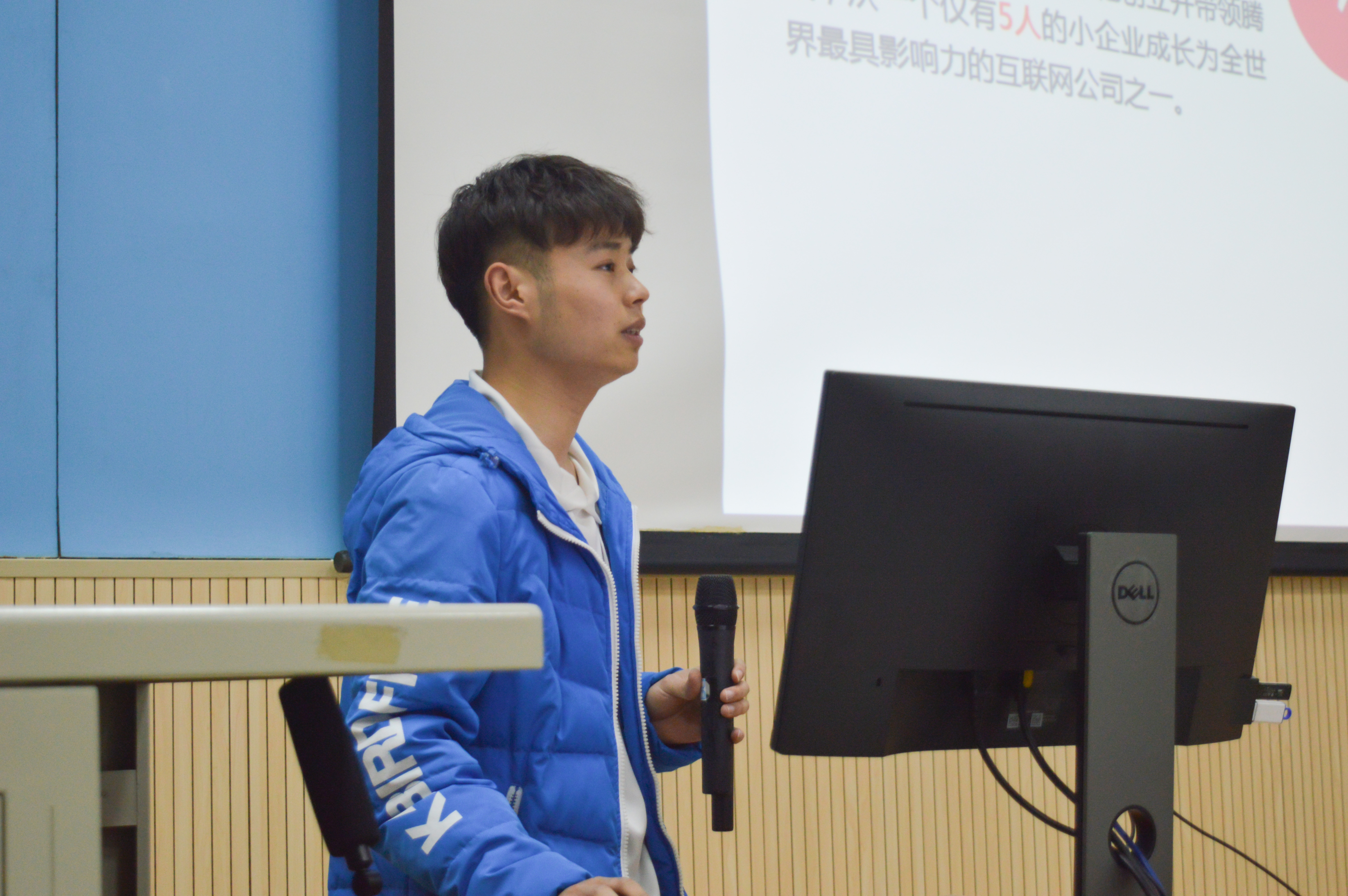 宣讲伊始,蒋昌松简单介绍马化腾的基本信息。接着,他从学霸马化腾、股霸马化腾、Q爸马化腾三个角度详细地阐述了马化腾踏实、敏锐等优秀品质。随后,蒋昌松结合腾讯旗下的产品具体分析腾讯的创新与改革。此外,蒋昌松和到场学生分享了自己大学四年积攒的一些经验。他以自己在学生工作和学习时的选择经历向到场学生详细阐释“选择有时比努力更重要”。并且,他指出“当你不知道做什么的时候,就把离你最近的事情做好,只有行动才能决定价值”。