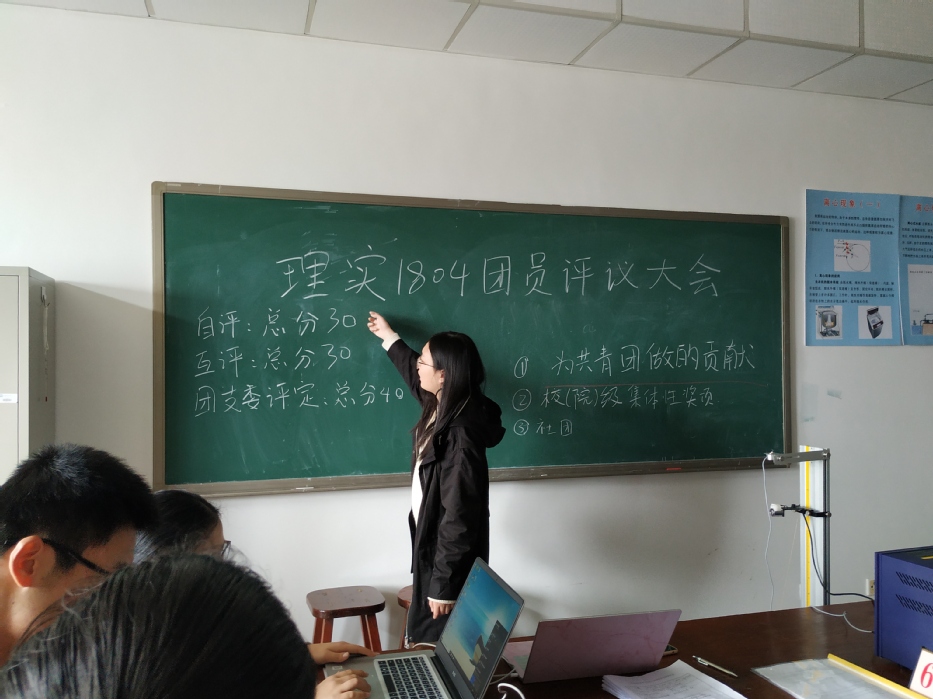 4月1日,理实1804团支部于基础实验楼D605召开团员评议大会,全体班委到场参加,部分学生旁听。经过前期的学习动员,团员自评和团员互评工作,本次团员评议大会的内容主要包括组织鉴定和总结评比。团支书陈雅薇讲解评议细则和标准,团支部副书记董朝阳担任会议主持人,宣传委员史佳记录,会议过程在班群中全程直播。所有参议的班委按照公平,公正,公开的原则,对每位团员提交的材料认真审核,并严格依照学院要求,按团员自评,团员互评,团支部鉴定三个步骤对每位团员打分评议,同时,团支部听取旁听同学的意见,在其监督下进行评议,确保对每位团员负责。