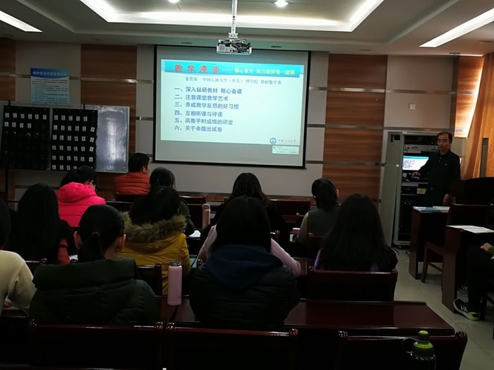 随后,金贵荣副教授为老师们做了题为《教学漫谈——精心设计 努力讲好每一堂课》的报告。金老师结合自身多年的教学实践经验,从每一个细节出发,小到黑板的使用,大到上课教学艺术等进行了详细论述,对于上好一堂课,金老师总结了几点:1、课前精心备课,深入钻研教材;2、注意课堂艺术;3、养成教学反思的好习惯;4、同事间相互听课与评课。