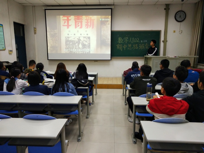 班会伊始,张水金以观看短片的形式带领班级全体成员回顾五四历史,学习五四精神;短片播放完毕后,班级成员杨文杰和宋广成上台分享自己的观后感言。而后,团支书王梓宣就本团支部目前状况及日后工作安排作出详细报告。张水金就班级日常事务及学习状态进行了总结,多角度多层面分析了班级期中考试成绩,并对接下来第一课堂、第二课堂的发展提出规划方案,决定实施考前小课堂、实行难题共享与讨论、加强PU管理和班级自媒体平台的运营等方案。最后,班主任吴国丽对此次班会进行总结,并对同学们接下来的学习生活提出可行性建议。