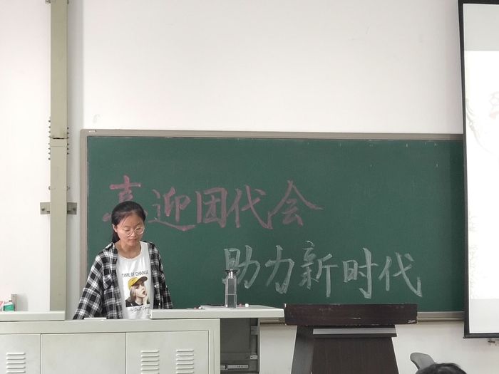 会议伊始,李天娇简单说明了这次会议的主要目的。随后,信息1802团支部全体成员合唱团歌。李天娇简要介绍了共青团的历史,团徽,团旗等团的基本知识,接着,她重点讲解了团代会的主要内容,分别从团代会的内容,团代会筹备阶段,预备会议,正式会议进行了介绍。为调动讲座氛围,李天娇进行了有奖问答环节,她针对所讲内容进行了提问,单场人员都积极抢答,阐述自己对团代会的认识。最后,李天娇带领全体成员宣誓了入团誓词,班委们上台板书了自己对团代会的期许。