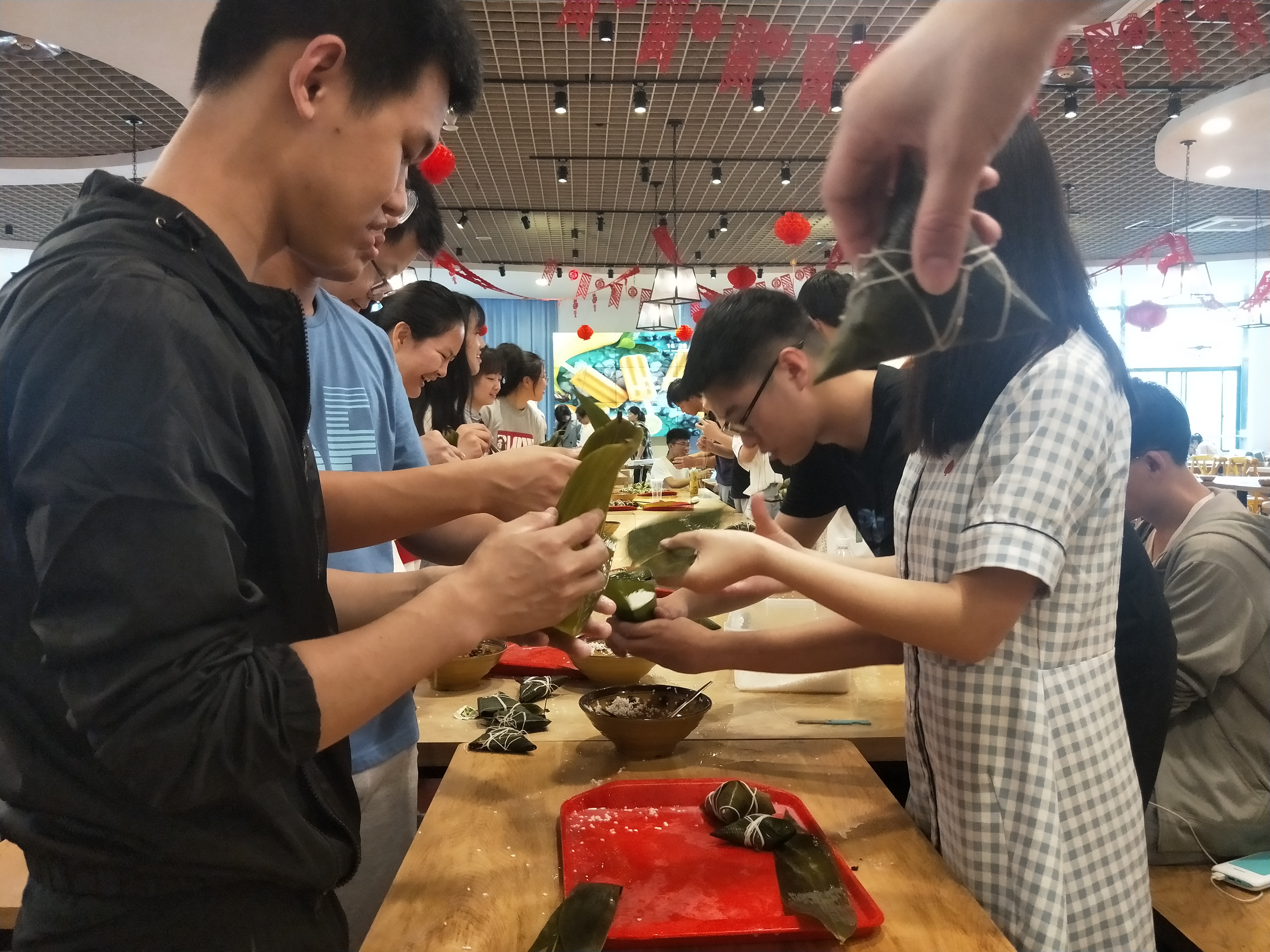 学生们积极动手包粽子 周文蓉摄