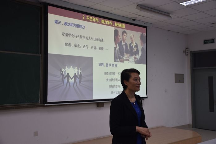 讲座伊始,主持人对姜翠玉进行了简要介绍,宣布本次宣讲会正式开始。首先,姜翠玉围绕“不负年华”“努力学习”“报效祖国”,从知识、素质、能力三个方面对同学们提出要求和建议。随后,她针对强健体魄、表达和沟通能力以及团队精神三个板块进行了详细的解说,不断提到青年人要怀揣梦想、不忘初心。最后,姜翠玉表示,在“问渠哪得清如许,为有源头活水来”这句诗中,活水代表着青春,源头则是坚定的理想信念。