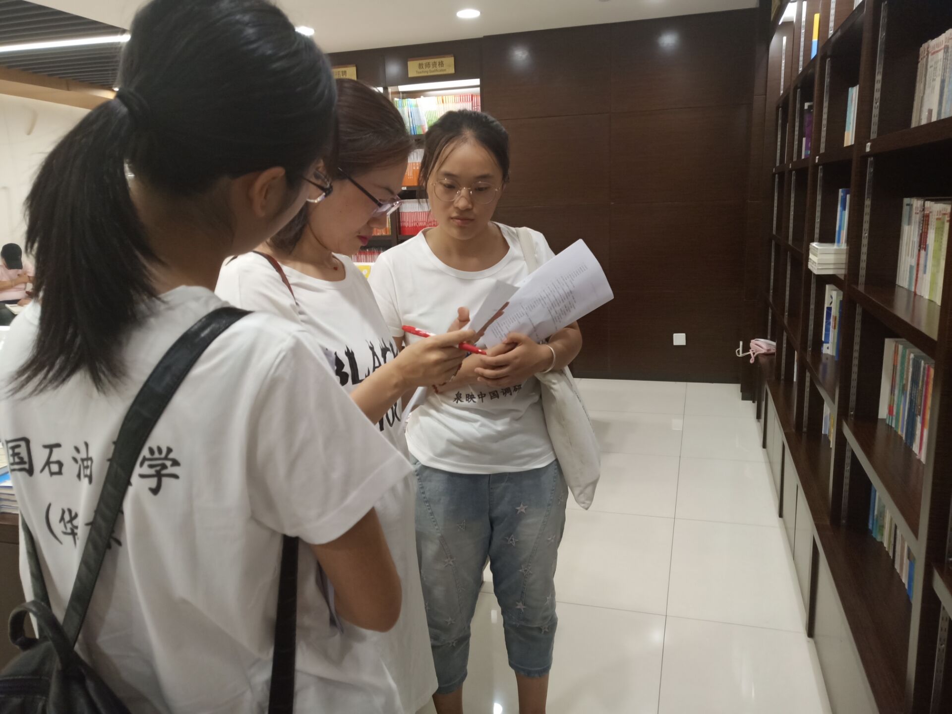 首先,队长范雯雯经过与山东书城负责人的联系后,与山东书城前台的负责人员解释商定本次活动的有关事宜以及介绍信的处理问题。随后,范雯雯将全体成员分成两个小组,每一组负责三个楼层的问卷发放,同时,为了提高队内成员的交际与沟通能力,范雯雯强调,每个人都必须要进行一次采访。随之,每个小组组内成员协调录音,录像,采访的工作调配,讨论完毕后,小组成员开始进行问卷发放,间或进行一次采访。最后,两个小组将填写完毕的问卷交给队长,由队长范雯雯组织,全体成员于山东书城门前进行合影留念。