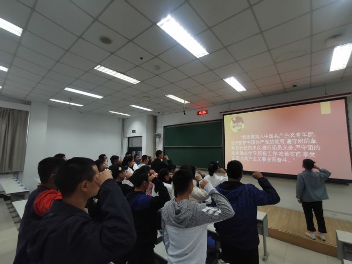 活动伊始,主持人介绍活动主题“我与祖国共奋进——国旗下的演讲”,然后活动按照齐唱国歌,重温入团誓词,齐唱团歌,优秀团员代表发言的顺序依次进行,其间,田祖荣同学“贫穷落后的小渔村里,绚丽夺目的千万高楼平地而起;波涛汹涌的长江上,雄伟壮观的大桥巍然挺立”细数七十年风雨兼程;王凯同学“爱您的方式有千万种,但此刻我只想对您说,我爱你,祖国!”的大声告白;孙宇曦同学 “耳边仍是《红旗颂》荡气回肠的旋律,眼前仍是五星红旗庄严又热情的红色。祖国放心,前进路上必有艰险,青年们定为您出谋划策与您同扛” 对未来的无限展望。在活动最后,徐志杰老师为同学们开展微团课活动,团支书对团日活动进行总结,并进行拍照留念。