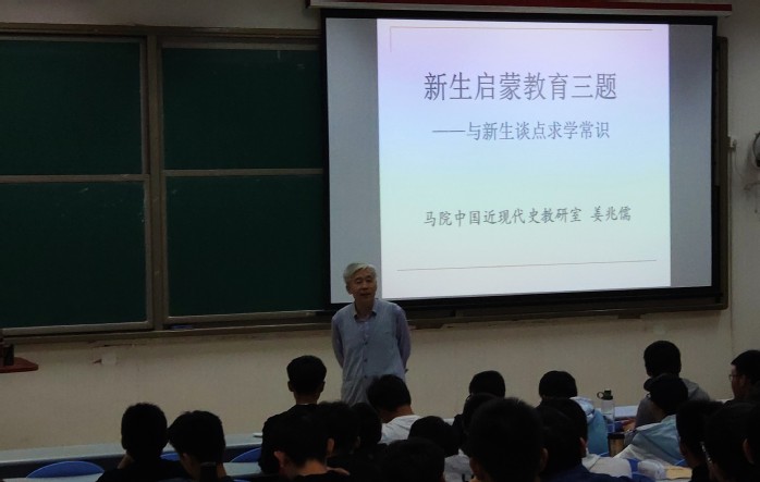 姜兆儒结合实际教育形势、现代学者通病指出,当代大学生不能只拘泥于课本上的知识,而要广泛阅读,知其然,更要知其所以然。他呼吁学生大胆质疑,甘坐冷板凳,勇攀学术高峰,并告诉学生,对于出类拔萃的老师,要盯住他,敢于提问。他指导学生读书要立足于教材,更要跳出教材。紧接着,他又教诲大一新生做优秀学者,更要先做有德行,有涵养的人。他以自己的经历为例,向学生展示如何成为品德高尚的人。最后姜兆儒分享了自己对大学生的期望,那就是要做有理想,有本领,有担当的新时代青年。