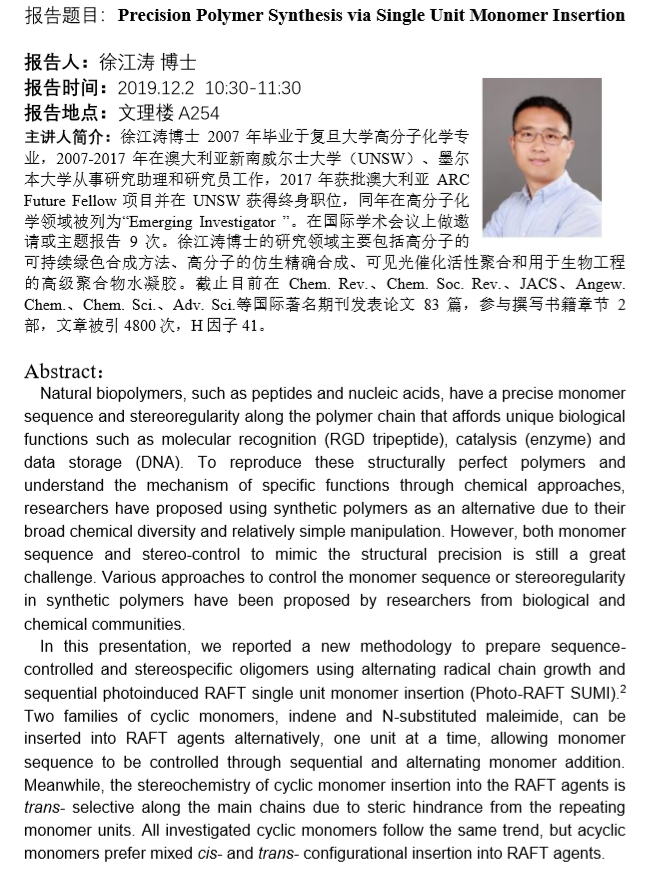 学术报告:Precision Polymer Synthesis via Single Unit Monomer Insertion