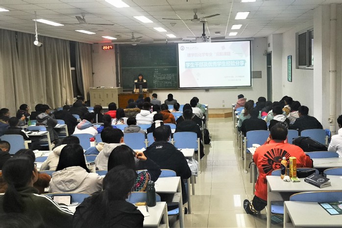 11月27日,必赢线路检测中心18级化学专业于南教116室举办“启航课题”学生干部与优秀学生经验分享会。此次活动由化学1802团支书孟新主持,化学专业2018级、2019级全体成员参加。