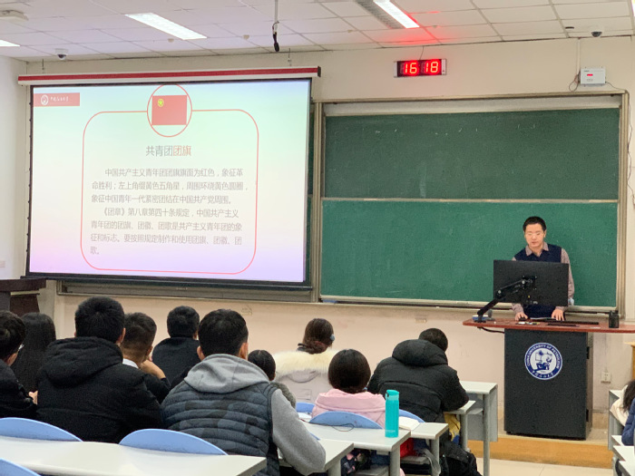 开班仪式在庄严的《义勇军进行曲》中拉开序幕。接着,2017级化学专业商静宣读班级纪律条例,督促学生干部严于律己,把握机遇,培养担当精神。“每一个学生干部是在积极为学院做贡献,帮助同学完成好各类工作,而不是只为了自己丰富的简历”陈银吨如是说,他强调,态度端正是一切进步的根源,并就端正态度举事例详细阐述。随后,陈银吨就共青团的基础团务进行系统说明,并具体讲解加入中国共产党的步骤和要求。始于纪律,终于情怀,陈银吨以自身工作感想,对学生干部提出诸多具体要求并详细解说,劝勉全体学生干部在工作中要一丝不苟,勇于锻炼,乐于奉献,在生活中培养理想情怀,为人善良,光明磊落。班课最后,陈银吨以习近平主席对传媒工作者的指导“要切实掌握脚力,脑力,眼力,笔力”呼吁全体学生干部不断成长,在奋斗中不断前行。