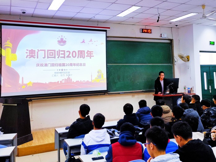 为庆祝澳门回归祖国二十周年,铭记历史,发扬爱国主义精神,12月21日下午,应用物理1901与化学1901团支部于讲堂群东环203共同举办主题为“庆澳回归,感恩祖国”的特别活动。