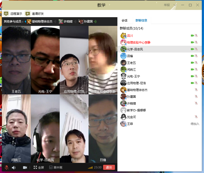 会上,各系(中心)教学副主任分别对本单位开课一周以来线上教学开展情况进行汇报。学院共有200余门理论课和实验课程的基础理论课开课,线上教学总体运行情况良好。任课教师使用我校云课堂、雨课堂、钉钉、腾讯会议等多种教学平台、软件线上授课;学生通过课程视频弹幕、交流群留言、在线答题等方式与任课教师进行课程教学互动。为弥补线下实验的暂时缺失,物理实验中心对学生开放了虚拟仿真实验项目,供学生学习和体验。目前,已经有1000+学生进行了虚拟仿真实验项目的学习。数据科学与大数据导论课程布置了整理当前新冠肺炎疫情相关数据(可以借助他人平台,也可以自己收集),并对数据进行预处理、分析、可视化的大作业。为了保证线上教学的顺利进行,各教学系(中心)引导任课教师采用多种组合形式进行教学,制定多个应急教学预案,提前上传课堂教学资料供学生学习。得益于前期充分的准备工作,视频网络延迟卡顿、教学平台无法登陆等问题的影响降到了最低,保障了线上课堂的教学效果。