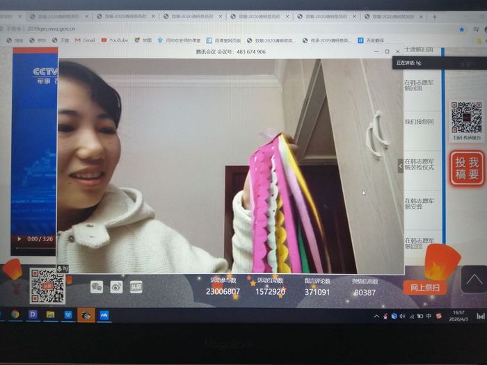 活动伊始,秦雪雅对此次活动流程进行简要介绍。接着她向同学们讲述收集到的英烈的光荣事迹,并且邀请几位同学分享他们知道的革命先烈事迹。然后采用投屏的方式观看革命英烈斗争的视频并邀请同学来谈一谈他们各自的感想。之后秦雪雅介绍了医护人员和社会各界人士在抗疫过程中做出的贡献以及中国在世界抗疫中体现的形象。接下来黄经介绍了自己家乡迎接清明节的习俗——剪镖子。最后,秦雪雅总结此次活动并向同学发起新时代牢记历史、缅怀先烈、面向未来的号召。