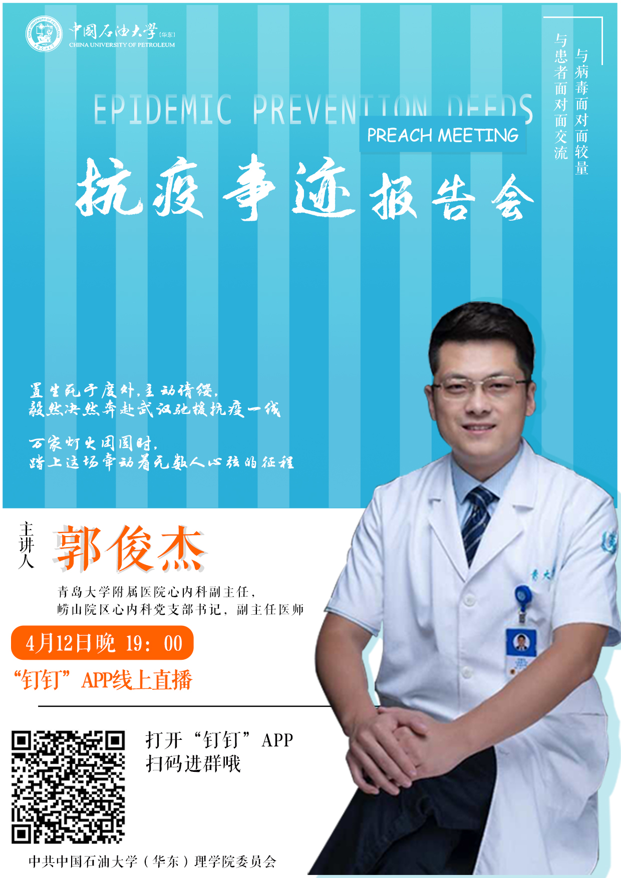 在抗击新冠肺炎疫情过程中,我院广大师生勇于担当、积极投身疫情防控斗争,有的克服重重困难确保学校“停课不停教、停课不停学”工作顺利开展,有的积极捐款捐物关爱抗疫人员,有的踊跃投身抗疫志愿服务活动,有的积极创作网络文化作品助力抗疫,用实际行动彰显了我院师生风采。为营造勇于奉献、敢于担当的良好氛围,引领广大师生厚植爱国主义情怀、彰显拼搏奋斗精神,为坚决打赢疫情防控阻击战继续贡献力量,学院党委特邀援鄂抗疫医生——青岛大学附属医院心内科党支部书记、副主任医师郭俊杰举办抗疫英雄先进事迹报告会,现将有关事宜通知如下: