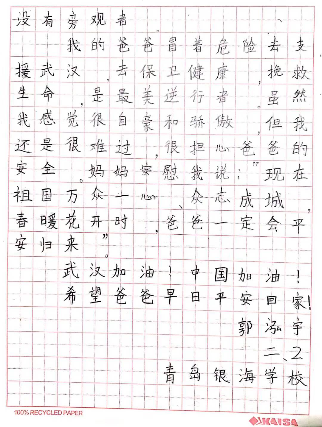物理1702司亚玺在听课后深有感触:“郭俊杰医生是无数奋战一线医护人员的缩影,在此向奋战在疫情防控第一线的医务人员致敬,向伟大的祖国致敬!一线医护人员们顽强的意志品质和强大的精神力量深深影响着我们当代大学生,我们要传承和发扬抗‘疫’精神,不负韶华,砥砺前行。”
