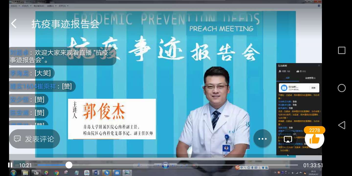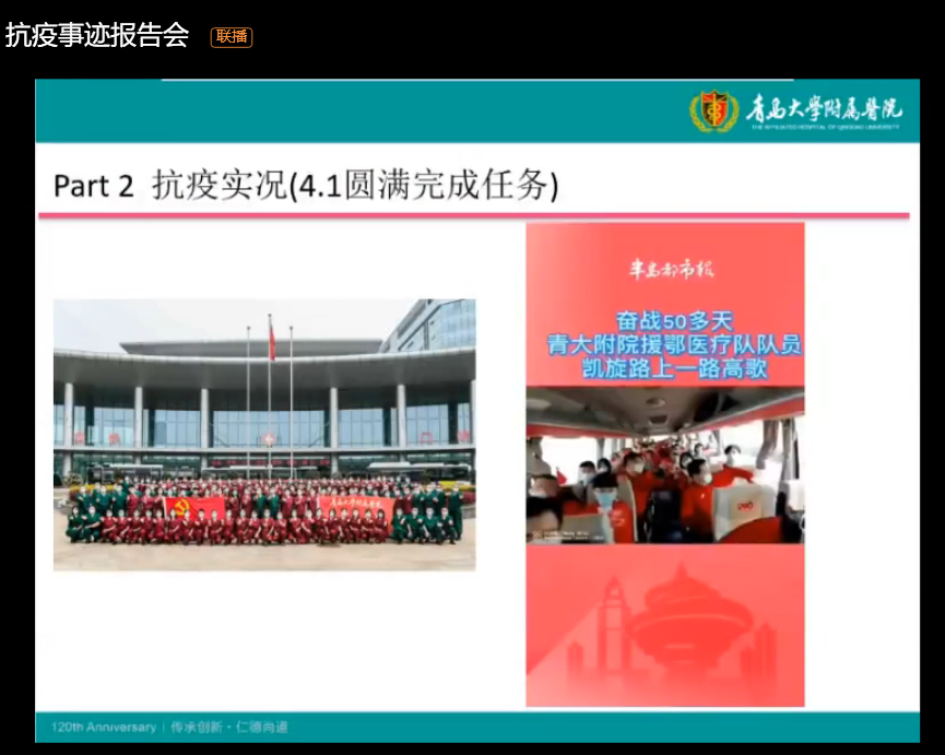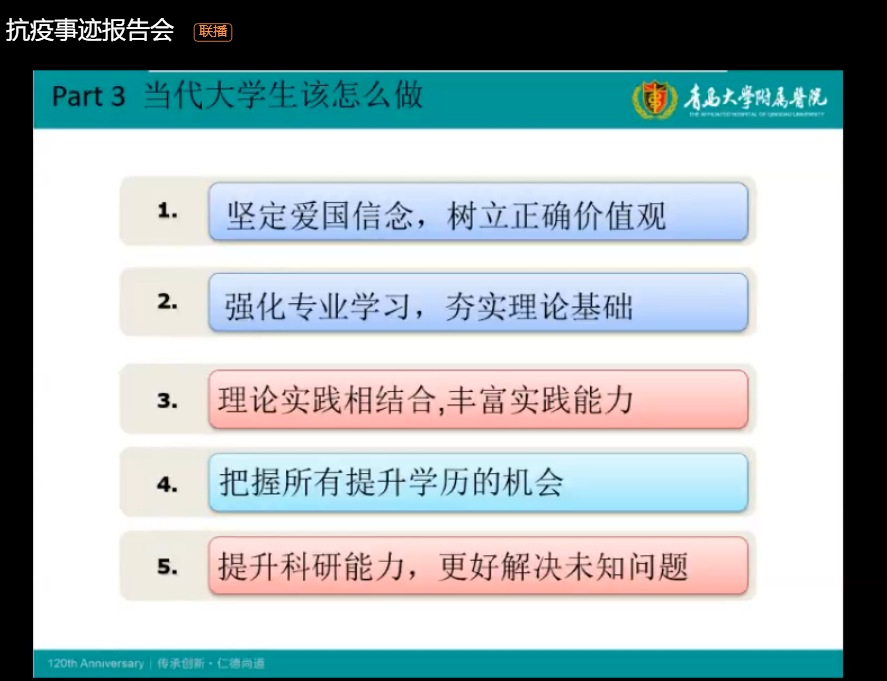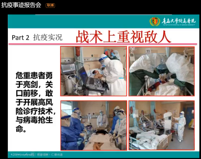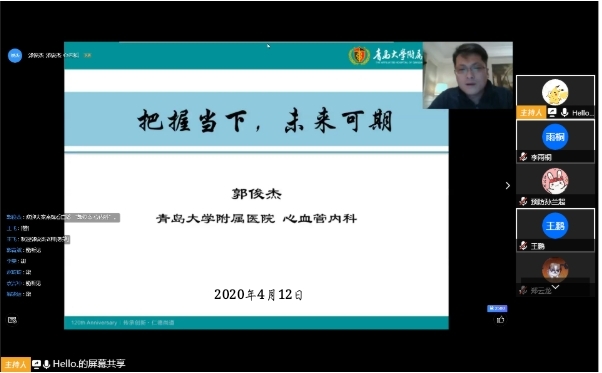 4月12日晚,青岛大学附属医院心内科副主任、崂山院区心内科党支部书记、援鄂医生郭俊杰做客必赢线路检测中心云端报告会,以“把握当下,未来可期”为主题为学院1300余名师生讲述援鄂52天的一线经历与感受。