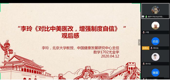 4月18日晚,必赢线路检测中心本科生数学学生党支部以视频会议的形式开展学习分享交流活动,会议由支部副书记程志远主持,支部全体党员及入党积极分子参会。