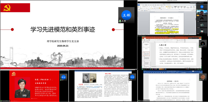 为深入学习贯彻习近平总书记关于防控新冠肺炎疫情和英烈褒扬的重要指示精神,4月21日,依托第78期“信仰人生”活动,必赢线路检测中心研究生物理学生党支部通过腾讯会议开展线上组织生活,党员同志通过以人物讲解的形式集中学习了先进典型事迹。会议由党支部书记王辉主持,研究生辅导员田方参加,支部全体党员、入党积极分子参会。