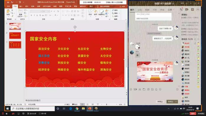 4月14日,支部组织全体成员观看我校讲座网推出的“国家安全教育视频”,让支部成员基本了解国家安全。4月15日,团支部组织观看谭书臻老师带来的”从新冠肺炎疫情谈生物安全”直播讲座,使学生结合新冠肺炎疫情对国家安全有了深入的认识。在这两项活动中,大家都及时观看并截图留存。为检验团支部国家安全教育的成效,4月16至4月20日,支部全体成员参与国家安全知识竞答,平均分已达及格水平。4月18日,支部召开国家安全教育主题班会进行交流讨论,团支书耿志轩介绍国家安全基本概念和基本内容,学生们结合真实案例讨论国家安全的重要性,认识到应该从身边的点滴注意国家安全。