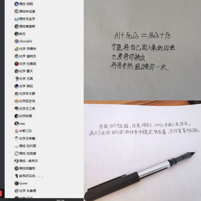 活动准备阶段,全体团员自行观看革命先烈为国奋斗的励志视频,以书面形式简要记录感悟,并随后录制视频诵读《我们爱你啊中国》或一首自选古代经典诗歌。活动伊始,全体与会人员线上发送视频感悟的手写照片,由成都理工大学测控1901团支书武颖总结发言并通过分享屏幕与同学们共同观看“青春战疫”特别节目,全体成员共同了解远赴疫情一线的青年医护人员及志愿者的生活。随后,短片放映结束,由两班团支书主持活动,全体成员交流感想,发表对当代青年人肩负责任的理解和对英雄主义的看法。活动最后,团支书周钰发布此次活动后续任务,“今天我们跨校进行团日活动,也要留下一些有意义的东西,稍后请大家录制为抗疫加油的短视频,可以用上自己的专业知识来表白祖国,希望大家认真思考。”