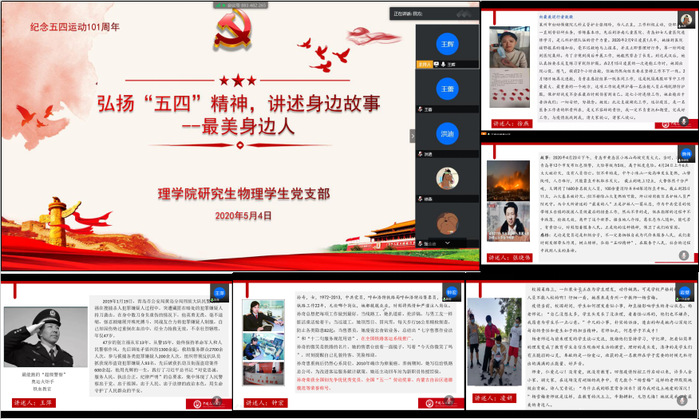 为引导广大青年党员继承和发扬五四精神,树立正确的社会主义核心价值观,激发忠党爱国的深厚情怀,培养一代有理想、有本领、有担当的优秀社会主义青年,5月4日,研究生物理学生党支部依托信仰人生第84期组织开展了以“弘扬‘五四’精神,讲述身边故事--最美身边人”为主题的线上党日活动。此次会议由党支部书记王辉主持,支部委员及支部全体党员、入党积极分子参会。