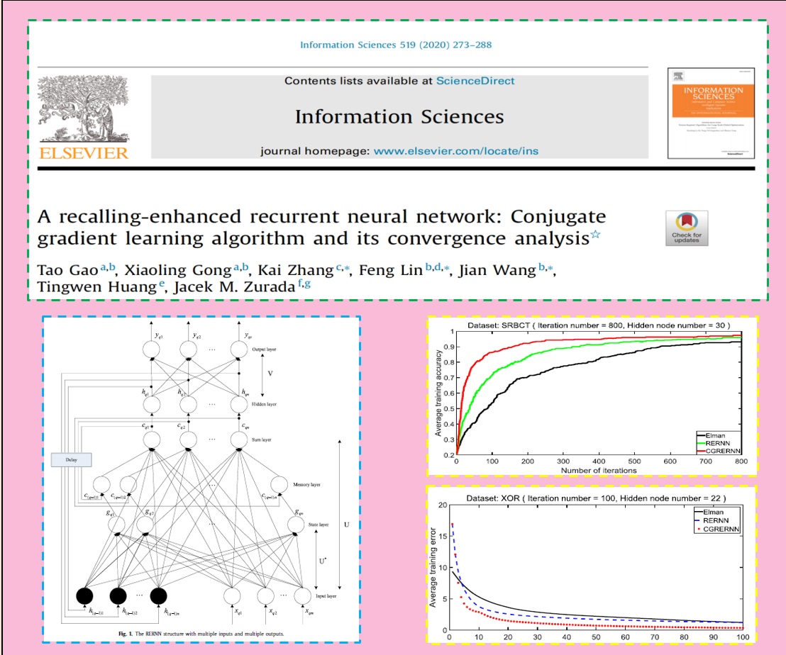 题目为《记忆强化循环神经网络模型:共轭梯度学习算法和模型收敛性》(A recalling-enhanced recurrent neural network: Conjugate gradient learning algorithm and its convergence analysis)的研究论文发表在人工智能领域计算机科学TOP期刊Information Sciences(T1 期刊,IF: 5.524)。博士生高涛为该论文第一作者,王健副教授和张凯教授为共同通讯作者,我校特聘教授及兼职博士生导师Jacek M. Zurada院士(美国路易斯维尔大学)参与指导,中国石油大学(华东)为第一署名单位。该项工作得到国家自然科学基金、国家科技重大专项、山东自然科学基金、中央高校基础研究经费、中国石油天然气集团公司重大科技项目以及山东省高校青年创新科技支撑计划的资助。循环神经网络因其结构特殊性,对解决人工智能中时间序列问题具有天然优势。该项工作基于最优化理论设计出一种新型记忆强化循环神经网络模型;为提升算法性能,通过构造自适应共轭梯度法对结构参数进行优化,分别从理论和实践两个方面验证了模型的合理性和有效性。