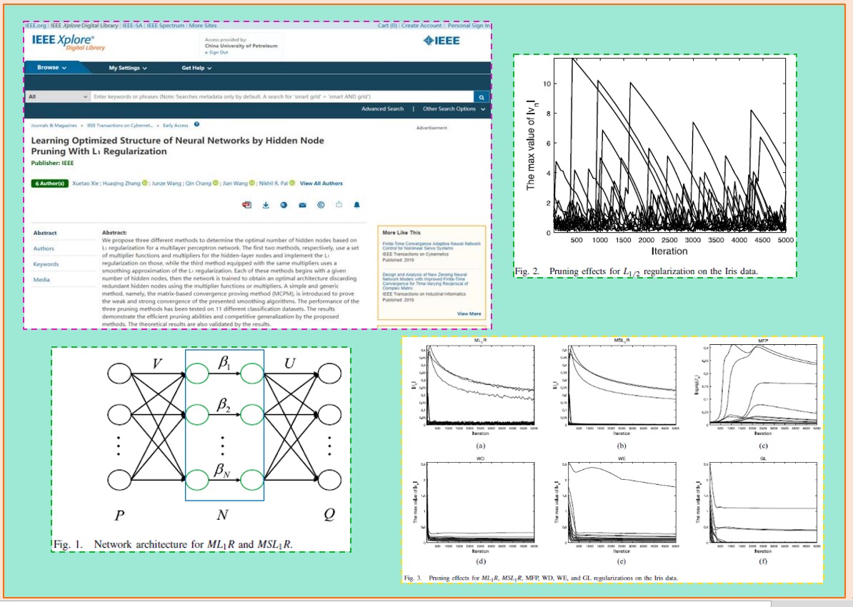 题目为《基于L1正则化的神经网络结构优化模型设计与分析》(Learning Optimized Structure of Neural Networks by Hidden Node Pruning With L1 Regularization)的研究论文发表在国际人工智能领域权威期刊IEEE Transactions on Cybernetics(T0期刊,IF: 10.387)。硕士生谢雪涛和博士生张华清为论文共同第一作者,王健副教授为通讯作者,我校荣誉教授Nikhil R. Pal院士(印度统计研究所)参与指导,中国石油大学(华东)为第一署名单位。该项研究成果得到了国家自然科学基金、山东省自然科学基金和中央高校基本科研业务基金的资助。该项工作借助L1正则子具有的稀疏表达能力,提出两种神经网络结构优化学习模型;本项工作另外一个突出贡献就是提出了一种简单且具有通用性的收敛性证明方法,同时保证了模型设计的合理性。实验结果表明所提出模型具有强大的鲁棒性、广泛的适用性、理想的剪枝能力和良好的泛化能力,适用处理高维大数据。该研究成果在人工智能与深度学习构造最简网络结构方面具有很强的指导作用和应用推广价值。
