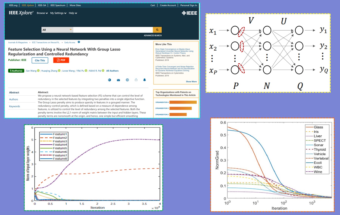 题目为《带Group Lasso惩罚与控制冗余的神经网络特征选择》(Feature Selection using a Neural Network With Group Lasso Regularization and Controlled Redundancy)的研究论文发表在人工智能领域权威国际期刊IEEE Transactions on Neural Networks and Learning Systems(T0 期刊,IF: 11.683)。王健副教授和博士生张华清为该论文共同第一作者,我校荣誉教授Nikhil R. Pal院士(印度统计研究所)参与指导,中国石油大学(华东)为第一署名单位。该项工作得到国家自然科学基金、国家科技重大专项、山东自然科学基金、中央高校基础研究经费、中国石油天然气集团公司重大科技项目以及山东省高校青年创新科技支撑计划的资助。特征选择技术也称属性选择,是指从原始特征或属性中选择出最有效的特征或属性以降低数据维度的过程,它是人工智能数据预处理环节的重要步骤,也是大数据处理技术的重要环节。该项工作在神经网络中嵌入Group Lasso惩罚项并实现特征冗余控制,在选出对解决问题最有帮助、蕴含信息量最大的特征或属性的同时,控制所选特征子集的冗余程度,以达到降维的最优效果,从而使模型的泛化能力更强,降低神经网络模型产生过拟合的风险。