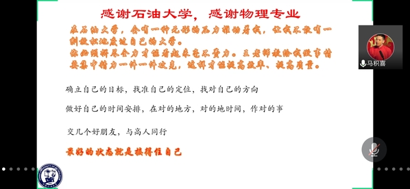 讲座伊始,王凯先对自己做了简介,后详细介绍中国工程物理研究院历史沿革,并对研究生院的历史沿革、现状及核物理与化学研究所有关研究生教育、科研平台及重要科研方向进行详细介绍。同时他为同学们展示许多精美的校园风景图,鼓励同学们积极加入核物理与化学研究所,以“铸民族基石、做民族脊梁”作结语。随后,马积喜详细介绍核武器的历史,研制过程,发表自己在我校学习的感悟,表达对石油大学和物理专业的感激之情,同时告诫同学们要接得住自己,即“一天比一天强!”以及强调锻炼健康身体的重要性;最后,马积喜从培养单位、特色培养、校园文化、学费待遇、招生计划、招生宣传夏令营(往年)、部分培养单位简介等七个方面对中物院研究生教育进行详尽解读。
