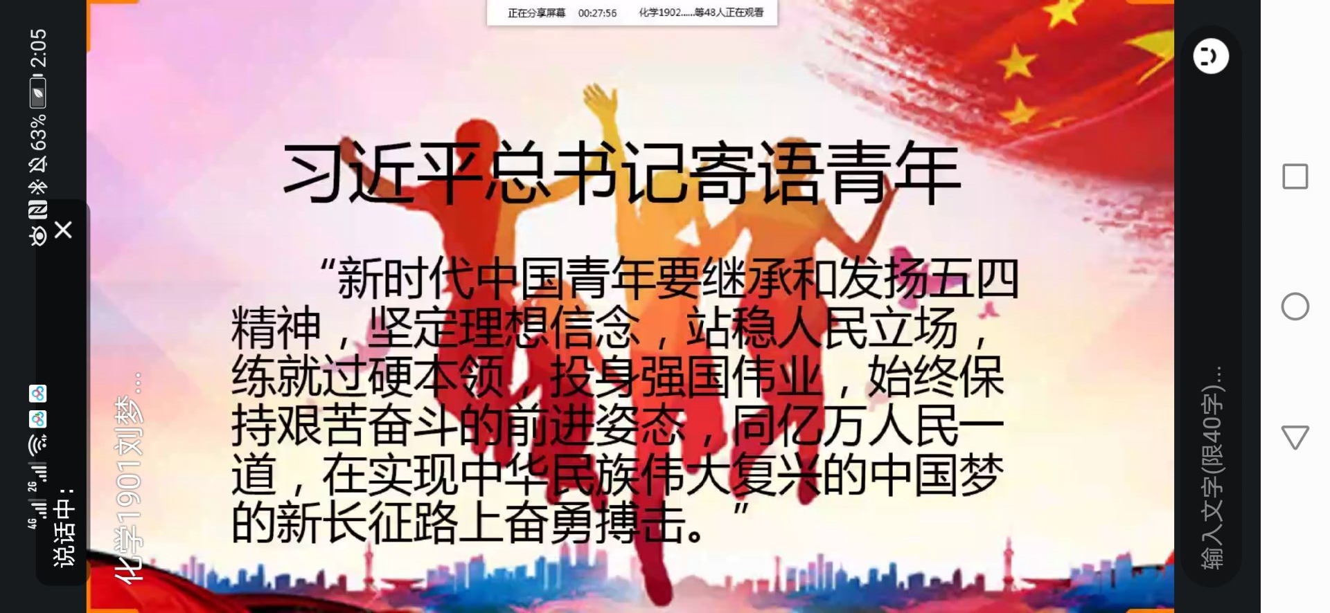 为提高全体团员的思想觉悟,带领支部团员纪念五四运动、学习深化五四精神,进一步领会习近平总书记青年寄语的深刻内涵,5月10日下午,化学专业2019级组织开展“继承五四精神,坚定理想信念”主题团日活动,活动由1901班和1902班的团支书共同组织举办,全体团员参与。