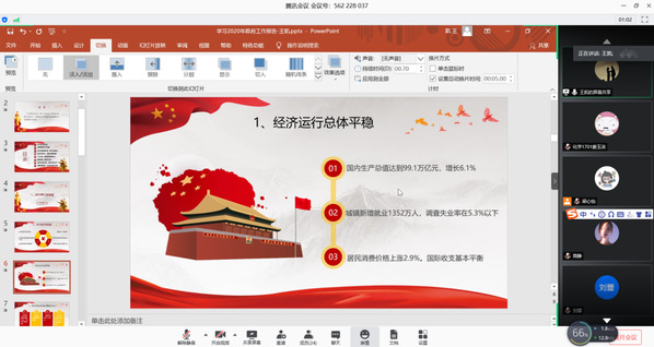 5月29日,必赢线路检测中心化学本科生党支部于腾讯会议召开了2020年政府工作报告学习研讨会议。此会议由党支部成员梁心怡主持,党支部书记田方出席,党支部全体成员参加。