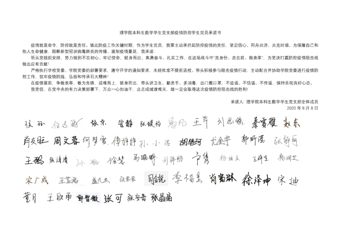 为了贯彻落实学生党员在抗击疫情领域的先锋模范作用,体现疫情就是命令、防控就是责任的精神,必赢线路检测中心本科生数学学生党支部于8月5日开展八月组织生活——“抗击疫情,党员先行”承诺签名活动。本次活动由张蒙蒙同志主持,党支部全体成员参加。