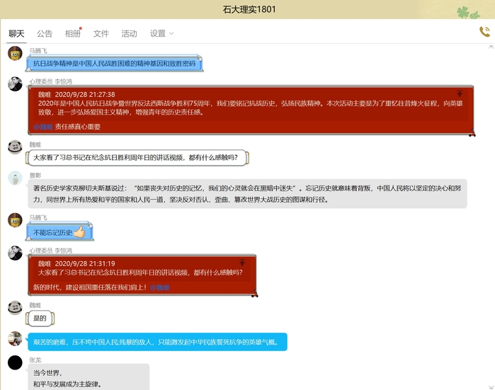 团日活动形式以观看视频并发言讨论为主,团支书点评为辅。首先,同学们利用空余时间观看了习近平在纪念抗战胜利75周年座谈会上的重要讲话视频,分别记录各自的心得感悟。随后,在讨论环节中同学们踊跃发言,阐述对于抗战历史的不同观点和看法。活动进行中,景影引用著名历史学家克柳切夫斯基的一句话“如果丧失对历史的记忆,我们的心灵就会在黑暗中迷失”坚定了本人“反对否认、歪曲、篡改世界大战历史图谋和行径”的立场。最后,团支书魏唯为同学们分享了电影《八佰》讲述的历史故事并进行总结,她表示“回顾历史,是对抗战英雄们最好的纪念。”