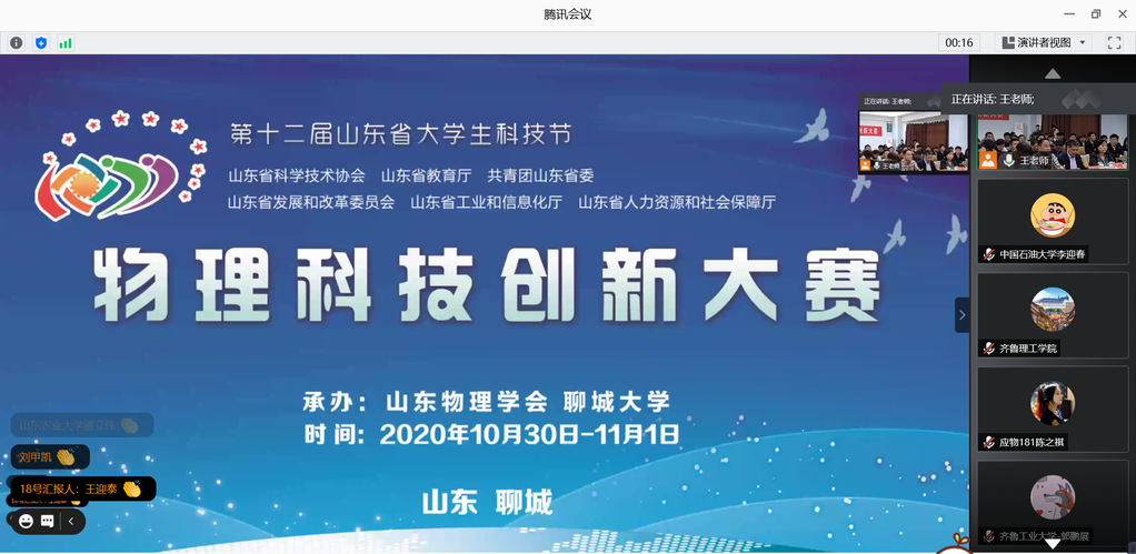 10月31日,山东省第十二届大学生科技节-物理科技创新大赛在聊城大学举行。本次比赛是山东省大学生科技节的组成版块之一,是展示全省相关专业大学生科技创新成果、提高大学生综合素质的重要舞台,吸引了包括山东大学、中国海洋大学、哈尔滨工业大学(威海)、山东科技大学、海军航空大学等33所院校233支队伍参赛。经过校内选拔,我院共有8项作品入围。本次比赛受疫情影响通过腾讯会议,采用网络展示、答辩的方式进行,经过专家评审,我院最终获得一等奖3项、二等奖3项,三等奖2项。