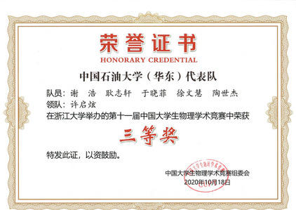 2020年8-11月份,我院代表队连续参加了中国大学生物理学术竞赛华东区赛,中国大学生物理学术竞赛,山东省大学生物理学术竞赛系列赛事取得佳绩。在8.24-8.27由浙江大学承办的中国大学生物理学术竞赛华东区比赛上,我院获得团体二等奖,于晓菲同学以最高分获得最佳女生奖,我院首次获得全国赛资格。在10.16-10.18日举行的由浙江大学承办的中国大学生物理学术竞赛上,我院获得团体三等奖。在11.6-11.8日由哈尔滨工业大学(威海)承办的山东省大学生物理学术竞赛上,我院代表队获得总成绩第四名、团体二等奖,于晓菲同学获得了最佳队员。这些成绩都是我院自2018年参与该系列赛事以来的最好成绩。