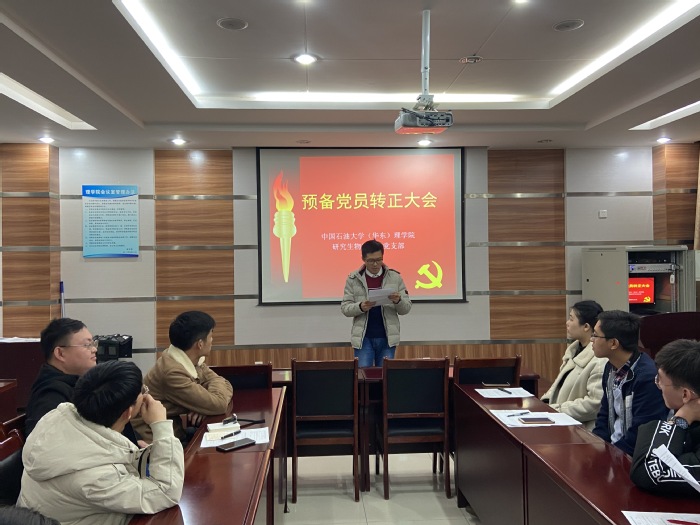 11月30日,研究生物理学生党支部在文理楼254会议室召开了预备党员转正大会。大会讨论关于魏玉鹏等3名同志申请转为正式党员的问题,支部全体党员参加,党支部书记王辉同志、支部全体党员参加,会议由孙淑怡同志主持。