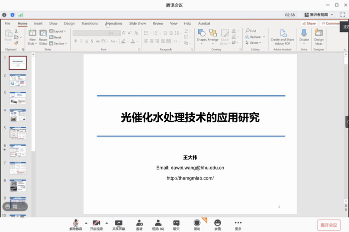12月8日,必赢线路检测中心利用腾讯会议在线举办了“名师有约”第100期活动,来自克莱姆森大学的研究领域为新兴微量污染物的去除和污染的副研究员王大伟博士为我校热爱光催化水处理技术的师生进行了题为《Photocatalysis on water treatment》的学术报告,本次活动由我校曾景斌教授主持。