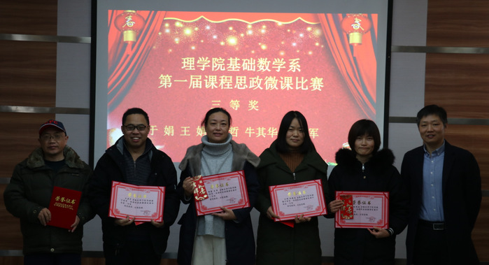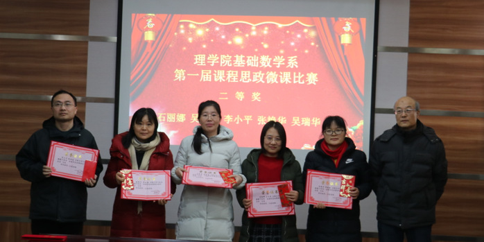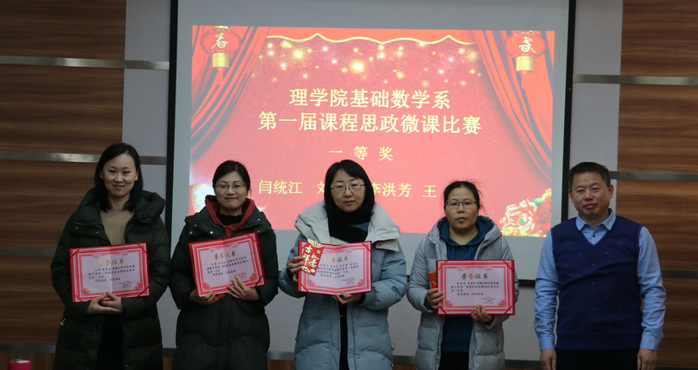 颁奖结束,魏宝君院长强调要以《高等学校课程思政建设指导纲要》为指引,以教书育人为导向,努力探索符合新时代要求的高等数学教学体系。王健主任指出要大力推进以“课程思政”为目标的课堂教学改革,使高等数学课程与思想政治理论课同向同行,全面提升基础数学系教师课程思政的教学能力。张丹青老师指出这次教学比赛的成功举行离不开系和学院都对此次活动的大力支持,离不开所有参与老师的坚持不懈,努力耕耘,展现了基础数学系强大的凝聚力和拼搏向上的精神。