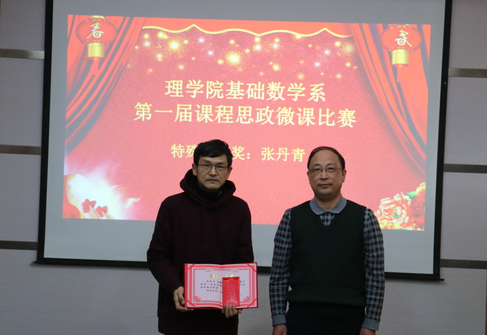本次思政微课比赛,按照全国微课比赛的要求制作PPT和录制微课视频,为了保证作品质量,系里组织多次试讲,张丹青老师全程参与指导,所有参赛团队教师充分挖掘思政知识点,从教学设计、PPT制作及最终的录制视频,每个环节都用心体会,一遍遍地打磨,充分体现了良好的团队协作精神。评比阶段,从校内聘请专家,分别从思政、数学内容、视频制作、讲课素养等方面进行评价,最终评出一等奖4项,二等奖5项,三等奖5项,张丹青老师获得特殊贡献奖。